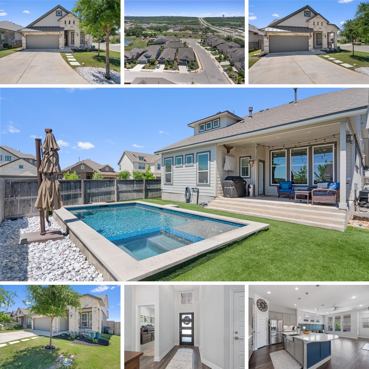 Welcome to this meticulously maintained home situated on a desirable corner lot in a quiet cul-de-sac in the highly sought-after Rancho Sienna community, part of the top-rated Liberty Hill ISD. This thoughtfully designed 4-bedroom, 3-bathroom home offers the perfect layout for multigenerational living, blending style, comfort, and functionality. The open-concept kitchen and living area are bright and welcoming, with large windows that fill the space with natural light. The kitchen is a chef’s dream, featuring elegant quartz countertops, a custom tile backsplash, and generous cabinetry. Matching quartz surrounds the living room fireplace, adding a sleek, modern touch. The main level includes both a spacious primary suite and a secondary bedroom, along with two full bathrooms—ideal for guests, in-laws, or extended family. Upstairs, two additional bedrooms, a full bath, and a versatile loft/game room offer flexible space for teens, college-aged family members, or a home office. Step outside into your private backyard oasis! A covered seating area and a built-in grill station (plumbed with gas) are perfect for entertaining. The custom heated and chilled pool and spa, built in 2023, allow for year-round enjoyment. The backyard features pet-friendly artificial turf for low-maintenance, clean outdoor living, and a separate fenced dog run adds extra convenience for pet owners. Living in Rancho Sienna means access to an exceptional community lifestyle—enjoy sweeping hilltop views, a resort-style pool, splash pad, 100+ acres of parkland, fishing pond, event lawn, miles of hike and bike trails, and a 24/7 fitness center. Conveniently located just 2 miles from H-E-B and other local amenities.