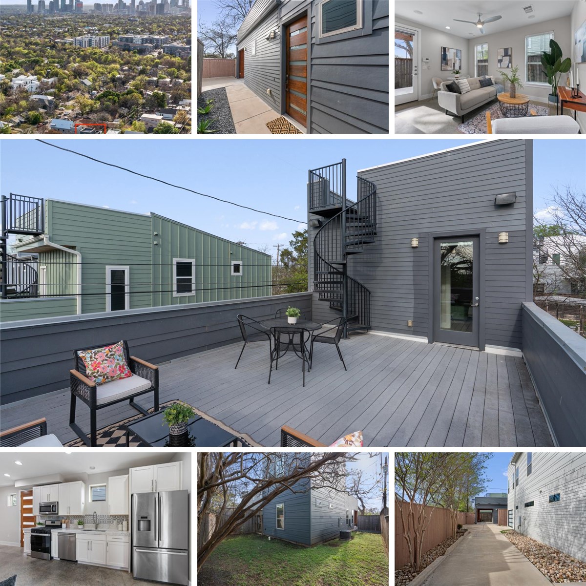 Modern 2-bedroom, 2-bath stand-alone condo with exceptional outdoor living and sweeping skyline views from multiple decks, ideally located in East Austin just minutes from Downtown, UT, major employers, and a vibrant dining and nightlife scene. Designed for both everyday living and entertaining, the home features seamless indoor-outdoor flow and contemporary finishes throughout. The interior showcases diamond-polished concrete flooring on the main level and wire-brushed oak floors upstairs, creating a warm yet modern aesthetic. The kitchen and living spaces are complemented by energy-efficient upgrades, including a tankless water heater, natural gas systems, and spray foam insulation for year-round comfort. The home also conveys with a refrigerator and stackable washer and dryer. Outdoor living is a standout feature, with a spacious second-story deck ideal for relaxing or hosting, plus a rooftop deck offering elevated city and sunset views. A private, shady backyard adds privacy and peaceful living. With modern finishes, multiple outdoor spaces, and a prime location, this property offers an outstanding opportunity for low-maintenance urban living at an exceptional value.
