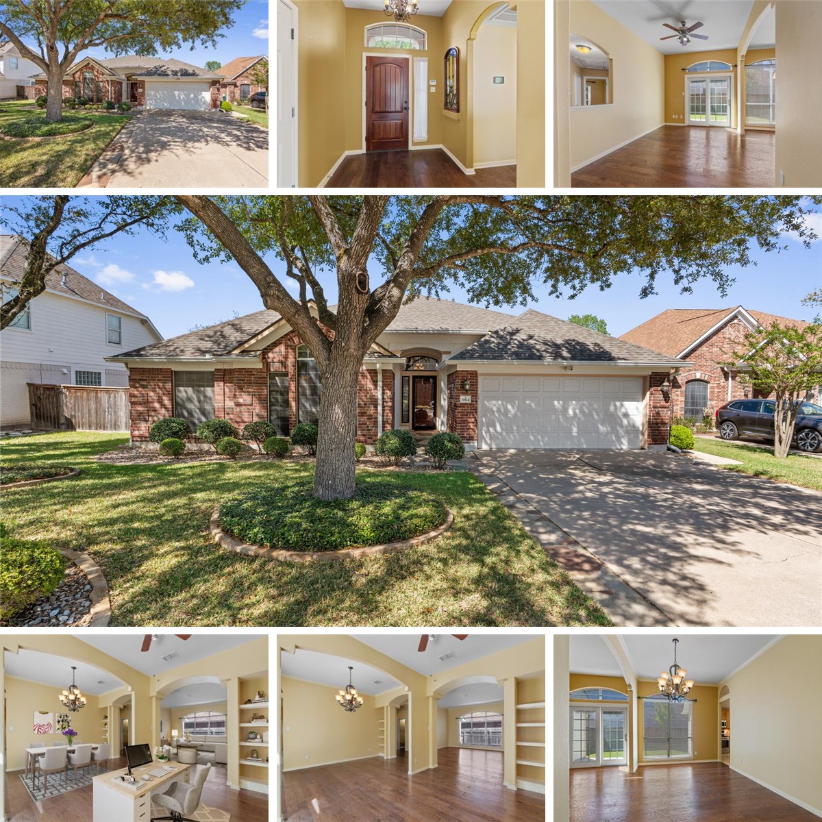 Tucked away in the established Harris Branch community, this spacious single-story home offers a flexible floor plan and peaceful privacy with no rear neighbors. Inside, warm wood flooring flows throughout the main living areas, creating an inviting atmosphere for both everyday living and entertaining. The family room serves as the heart of the home, featuring a cozy fireplace and easy connection to the surrounding living spaces. The updated kitchen is well-equipped with granite countertops, under cabinet lighting, and extended island providing both functionality and style. The thoughtfully designed layout includes three bedrooms, two and a half bathrooms and two flex spaces that can be used as a formal living, office, playroom or more. Step outside to the extended covered patio, where you can enjoy the green space behind the house. Two additional patio areas on the side of the home provide excellent entertainment options. With its spacious single-story layout, versatile living spaces, and desirable location, this home offers a comfortable and functional setting for a variety of lifestyles. Schedule a showing today!