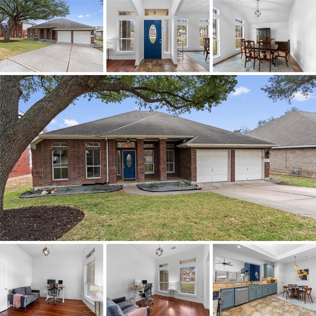 Welcome to this light-filled, single-story brick home in the Club at Wells Point, complete with a covered front porch and 2-car garage. Designed for comfortable everyday living, the open-concept layout features high ceilings and wood and tile flooring throughout. A home office and formal dining room greet you at the entry, offering flexibility for work and gatherings. The spacious kitchen includes granite countertops, stainless-steel appliances, abundant storage, a breakfast bar, and a huge skylight that enhances the natural light. The living room showcases a vaulted ceiling and stone fireplace, creating an inviting central gathering space. The primary suite offers wood flooring, a vaulted ceiling, a walk-in closet, and an en-suite bath with a granite dual vanity, jetted soaking tub, and large walk-in glass shower. Three guest bedrooms and a full bath provide plenty of space for family or guests. Outside, enjoy a private fenced yard and a back patio with built-in seating. Conveniently located near shopping, dining, and major roadways for easy daily living.